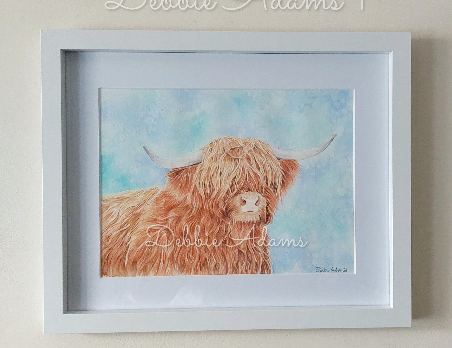 The back ground was painted in watercolour using salt and which has created the effect of falling snow. Like all my paintings it is highly detailed showing the texture and all the colours of the Highland cows.